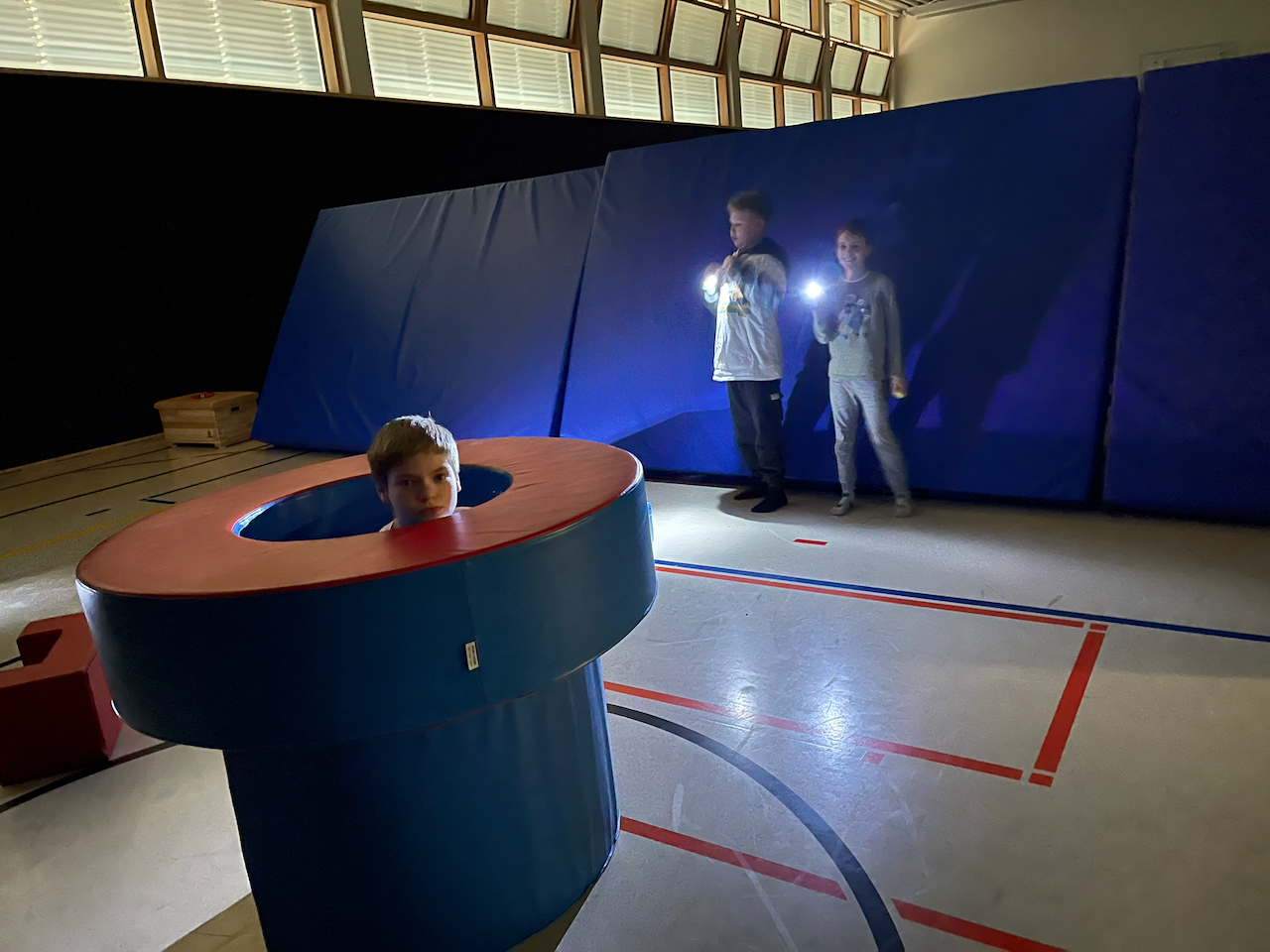Das erste der dieses Jahr gewählten Horror-Spiele. Und tatsächlich recht gruselig! Stattgefunden hat der Workshop nämlich nicht wie üblich in der mobilen Halle des SVGO, sondern in der Schulsporthalle der Grundsschule an der Oslebshauser Heerstraße, und die lässt sich richtig abdunkeln! Spätestens am Sonntagnachmittag bei der Präsentation war es dann ja auch draußen dunkel, sodass ein richtig gutes 5NaF-Feeling aufkam. Die Halle wurde in 3 Abschnitte unterteilt, in denen jeweils die "Monster" unterwegs waren. Die Bereiche wurden mit Kram aus dem Fundus der Halle bestückt, zum einen zum Verstecken, zum anderen für die Atmosphäre. Es gab jeweils ein Erkundungsteam und ein Team, das die Animatronics gespielt hat. Das Erkundungsteam war mit einem Funkgerät und Taschenlampen ausgestattet, deren Lichtstrahl die Animatronics auf Abstand hielt. Ziel war, heil im letzten Bereich anzukommen und das Schloss an der Tür nach draußen zu knacken. In jedem Übergang von einem Hallenteil in den nächsten gab es ein Zahlenschloss, für das man jeweils Rätsel lösen musste. In der ersten Halle waren Schwämme in verschiedenen Farben verstreut, ihre Anzahl war jeweils die Ziffer im farblich entsprechenden Ring am Schloss. In der zweiten Halle gab es Zettel mit Buchstaben zu finden, woraus ein Wort gebildet werden musste, das man dann per Funkgerät nach draußen gemeldet hat. War es richtig, gab es den Code für das zweite Schloss. Im dritten Teil gab es einen Zettel mit einem Wort, die Ziffern ergaben sich aus der Nummer des jeweiligen Buchstaben im Alphabet. Rätsel lösen und gleichzeitig die Animatronics auf Abstand halten, das ging nur mit gutem Teamwork, und war teilweise richtig stressig.