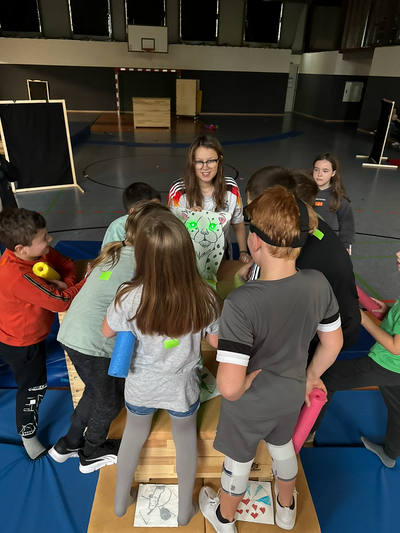 Am zweiten Tag haben wir zuerst mal ein Let's Play geguckt und analysiert, was es im Spiel so gibt und wie es aufgebaut ist. Das Team der Wissenschaftler muss die vier Teile eines Amuletts finden und zusammensetzen, um die Statue von Jumanji, einem Jaguar, wieder zum Leben zu erwecken. Dabei werden sie von allerhand NPCs angegriffen, außerdem gibt es Hindernisse wie hochschnellende Spitzen oder schwingende Riesenäxte. Es lag also auf der Hand, zwei Teams zu bilden, von denen die einen Aufgaben lösen müssen, während die anderen versuchen, sie daran zu hindern. Es wurde eine Spiellandschaft aufgebaut, in der verschiedene Aufgaben gelöst und die Teile des Amuletts gefunden werden mussten. Beide Teams waren mit Poolnudelstücken ausgestattet, um anzugreifen oder sich zu verteidigen. Das ging ganz schön zur Sache!