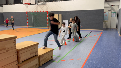 Die Sprayer haben an der Wand gewartet und sind irgendwann losgelaufen. Zuerst durften die Polizisten dann ebenfalls loslaufen, aber das hat sich nicht bewährt, weil es vor dem Kasten einen Engpass gab, sodass fast alle gleich weggefangen wurden. Deshalb wurde der Vorsprung geändert: Die Verfolger durften erst loslaufen, wenn der erste Sprayer die Matte hinter dem Kasten verlässt. Das eröffnete die kleine strategische Möglichkeit, zu warten bis alle auf der Matte waren.