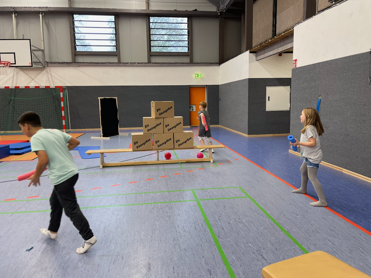 Wie schon bei Mario Kart hat sich auch hier gezeigt, dass die Pylonen nicht taugen, um einen Weg zu markieren – die Kinder laufen einfach drüber, statt im Slalom. Erst als dort Umzugskartons hingestellt wurden, klappte der Slalom.