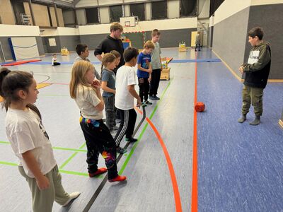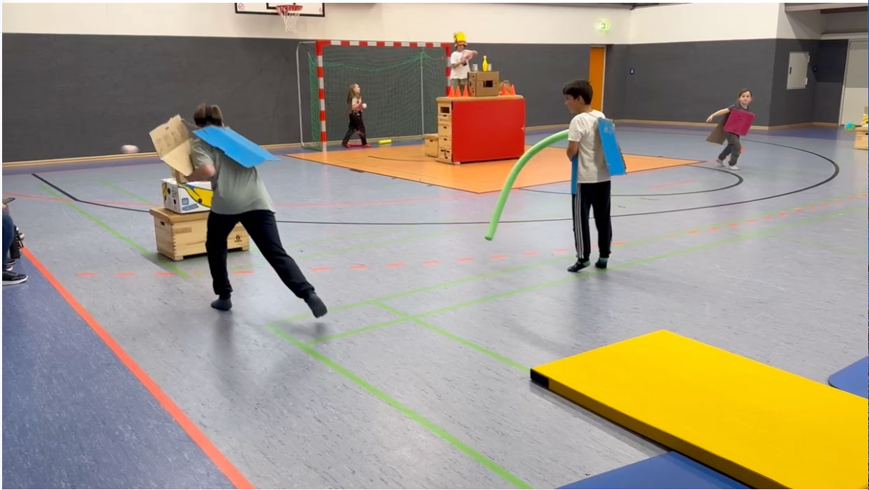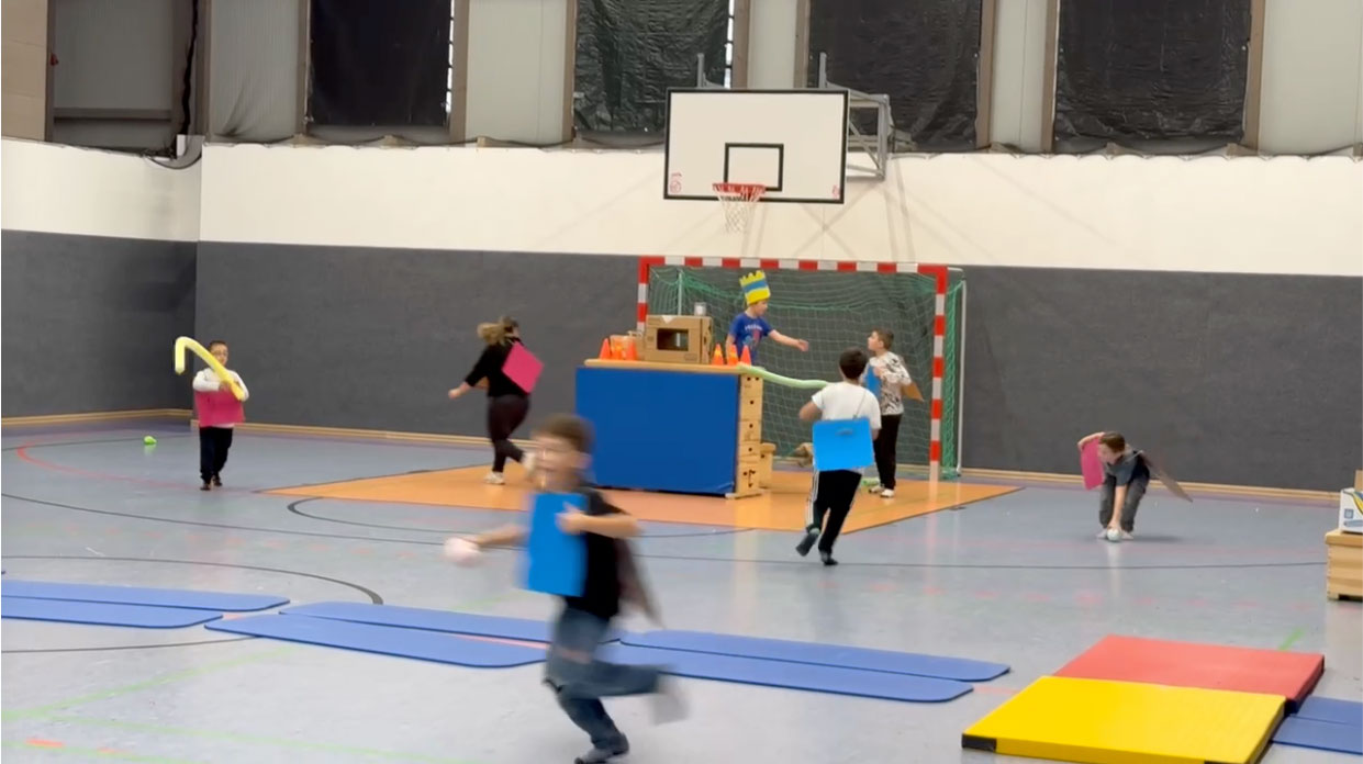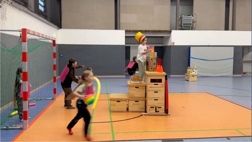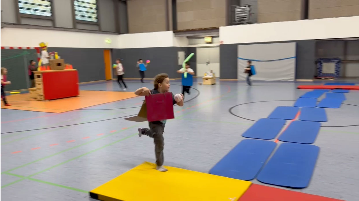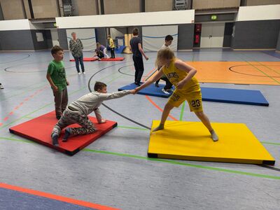 Weil's so schön war, haben wir wieder "Der Boden ist Lava" als Einstieg gespielt. Dieses Mal haben wir gelernt, dass man sich mit der Einschätzung der Erfolgsaussichten eines Teams echt vertun kann. Es hat nämlich das Team mit den Jüngsten und den beiden Mädels gewonnen – die haben das ganz souverän gemacht. Da sie die Matte nicht hektisch nach vorne geworfen haben wie die anderen Teams, hatten sie nie das Problem, dass die Matte zu weit weg lag – so wie hier auf dem Bild.